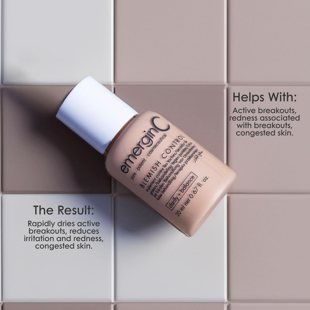 • emerginC Tinted Blemish Control acne treatment lotion on tiled background. Helps treat active breakouts, reduce redness and calm congested skin.